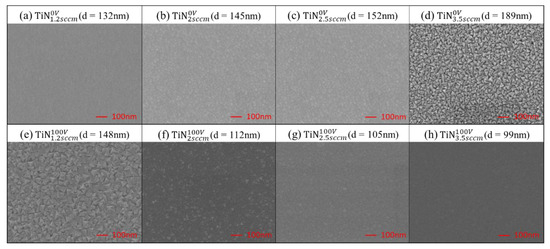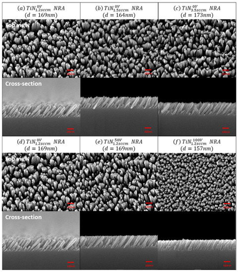 2 flow rates of 1.2 sccm and 3.5 sccm were fixed at 0.9 A/s and 0.4 A/s, respectively. Two sets of TiN NRA were grown with similar thicknesses, ranging from 157 to 173 nm. The first set was the three TiN NRAs deposited with substrate biases of 0 V, 50 V, and 100 V for an N