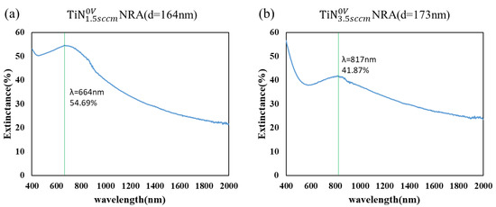 The second set shows that the maximum extinctance values are 92.9%, 94.8%, and 80.6% at wavelengths of 616 nm, 725 nm, to 876 nm for samples deposited at the N