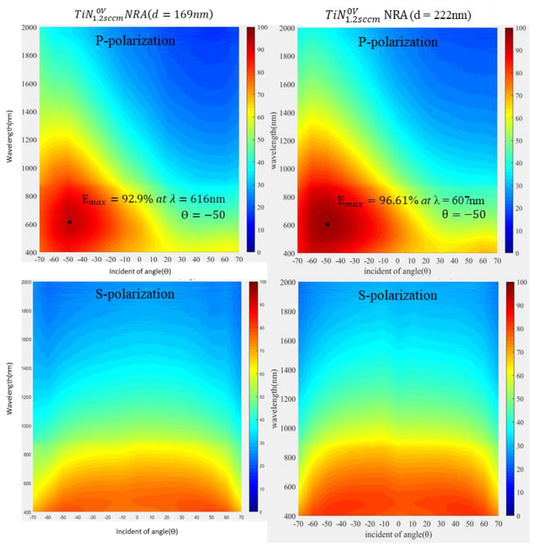 The s-polarized and p-polarized extinctance E spectra of those TiN NRAs were derived by measuring the reflectance R and transmittance T of each sample as functions of wavelength λ and angle of incidence θ using a Hitachi 4150 spectrophotometer. The extinctance E is given by 1-R-T, as shown in