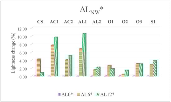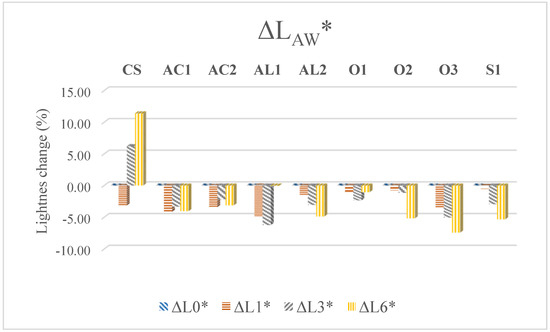 Total colour difference ΔE* calculated from measured colour parameters was the main indicator representing coating durability during weathering [18,22,30]. The specific colour parameters (L*, a*, b*) describe the colour change more closely. During AW, the observed increase of values a* and decrease of b* values showed a tendency of the wood surface to turn reddish and become less yellow shade. Decreases of both a* and b* parameters were observed during NW, which indicates the opposite trend. But in most cases, ΔE* was affected mainly by changes in lightness (ΔL*) as in the study of Oberhofnerová et al. [31]. Changes in lightness of different coating during weathering is illustrated in Figure 1. There are obvious differences in lightness parameters based on the weathering type-decrease (negative value) of lightness during AW (except reference samples) indicating a tendency to turn into darker and increase during NW indicating lightening. This trend is caused by the different weathering conditions and ratio of degradation and leaching of photodegraded extractives and lignins observed mainly on the transparent tested coatings. NW differing also in the presence of mould and dust and other pollution in exterior which infiltrate in the degraded surface of wood or coating [10]. These conditions are not simulated in laboratory testing [21,43]. But darkening of the surfaces caused by the action of pollutants and moulds was negligible during this period of NW and mainly leaching of darker oak extractives and changes in pigmented coatings caused increasing of L* parameter.