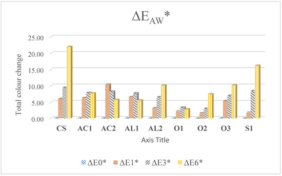 Total colour difference (ΔE*) of tested coatings, was closely linked to lightness changes. Control samples manifested the highest colour differences during both types of weathering. Total colour difference values are characterized by a systematic increase during exposure [43,44], with higher changes during initial phases of weathering [28,43]. In this study, only coatings AC2 and AL1 followed this trend during AW (Figure 2). The lowest colour difference was noticed for O1 during AW and O2 during NW, which is in accordance with lightness changes in Figure 1. Those were the only coatings able to protect the wood to the extent of ∆E* < 3, which is considered as a low colour difference that cannot be distinguished by a subjective observer [45]. These oil coatings differed from each other only by the type of pigments used (Table 1). The pigmented coatings (O1, O2, AL2, S1) were characterized by significantly lower colour changes than transparent ones.