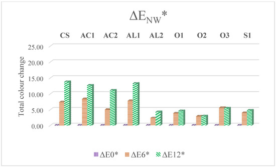 The total colour changes (ΔE*) were the most connected with the change of lightness parameter ΔL* (Figure 1 and Figure 2) as in the other studies [43,49]. The lowest colour changes were observed for oil coatings O1 and O2 (thin-layer oil-based with micronized pigments TiO2 and Fe2O3). The positive effect of white TiO2 pigments on photodegradation was already discussed in the work of Moya et al. [30]. The thickness of the coating system is a criterion affecting its service life [23] but for tested coatings in this work, the pigment content was the more important factor (Table 1, Figure 5 and Figure 6). The pigmented coatings generally provided more effective protection and reached the lower colour changes during NW than transparent ones as in the study of Sivrikaya et al. [48].
