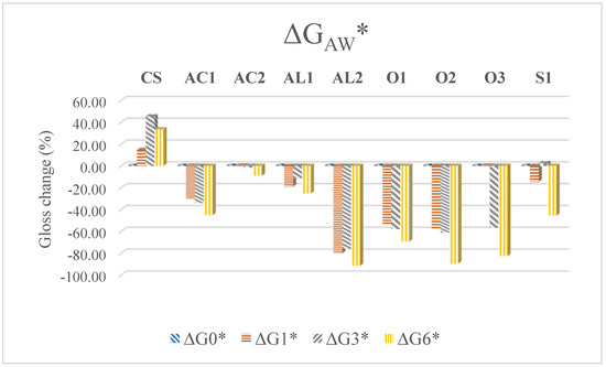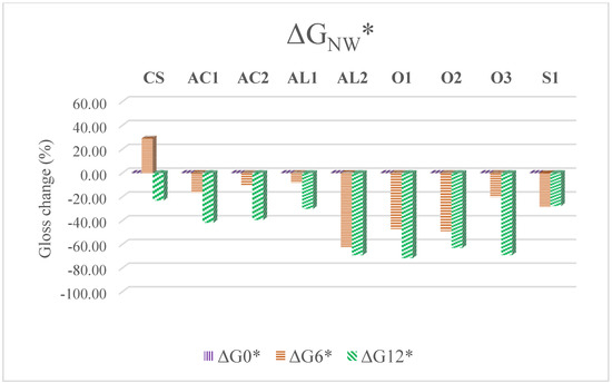 Except for small fluctuations, all coatings were characterized by decreased gloss values during both weathering methods (Figure 3). The reference samples, on the other hand, manifested increases in this property (with the decrease in the final phase of NW). The same findings regarding protected and unprotected weathered wood were found by Ghosh et al. [46]. The best results were noted for acrylate and AL1 coatings, while the highest changes were recorded for oil coatings.