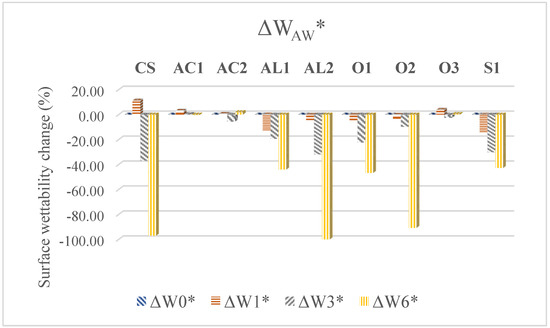 The contact angle, which indicates the wettability by water on the exposed surfaces of coated wood, is an important indicator of the rate of weathering [22,24]. Surface wetting changes (Figure 4) indicated the overall impairment of the protective function of the coating systems against water [24,39]. During AW, the most stable values were noted for acrylate coating systems and O3. The rest of the samples were characterized by decreased surface wettability (the most in the case of reference samples and AL2). During NW, the wettability decreased for all samples, but the smallest changes were also recorded for acrylate and O3 coating.
