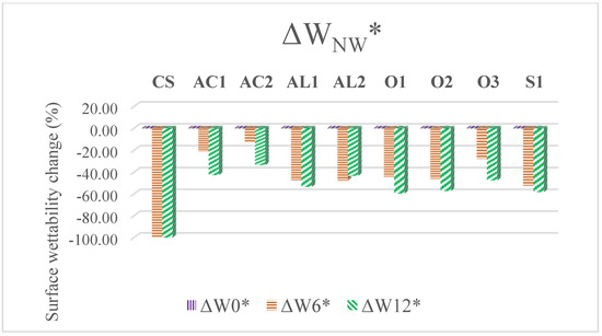 Surface wettability difference (ΔW*) of the tested coating systems during artificial and natural weathering (CS means control sample).