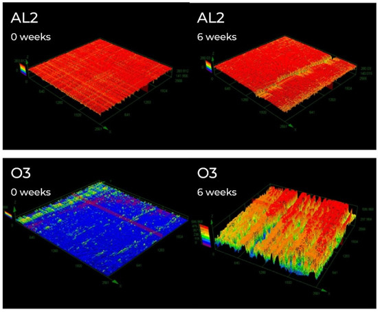 3D images of samples roughness profile for selected tested coatings with higher gloss change (AL2 and O3) are shown in Figure 8. It is possible to see increasing of roughness of the surfaces after 6 weeks of accelerated weathering. These images (Figure 8) also confirm that decreasing of gloss is influenced mainly by decomposition of coating film (O3) or its top layer (AL2) (see also Figure 5).