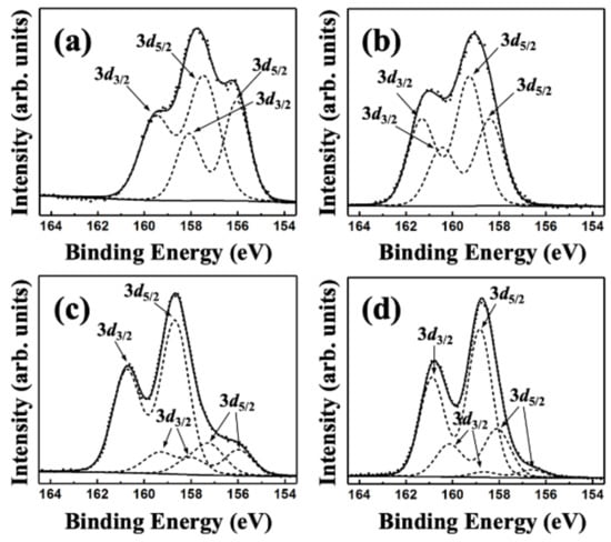 Figure 4 shows the XPS spectra for yttrium in Y2O3 and YO0.6F2.1 before and after the plasma treatment. We assigned dash lines the peaks in the XPS spectra to the cations of Y3d5/2 and Y3d3/2. The two peaks had a difference of 2.05 eV with an intensity ratio of 3:2 in their binding energy, which is consistent with the figure provided by national institute of standards and technology (NIST) []. In the case of pristine Y2O3, the Y3d5/2 peak positions were 157.35 and 156 eV, and the Y3d3/2 peak positions were 159.4 and 158.05 eV. When Y2O3 was exposed to the NF3 plasma, XPS analysis revealed binding energies of 158.65 eV for Y3d5/2 and 160.7 eV for Y3d3/2, which indicated binding of yttrium to fluorine and formation of Y–F bonds. Figure 4a consists of three Y–O peaks located at 159.4, 158.05, and 156 eV. As shown in Figure 4c, the peak shifted to higher energy could be attributed to the Y–F bond, which is possibly attributed to the different electronegativity of fluorine and oxygen atoms. When the oxygen atoms around the cations are replaced by fluorine atoms, more electrons transferred to fluorine. Therefore, the electron density around the cation decreases and the binding energy is enhanced []. This result indicates that the surface of Y2O3 reacted with fluorine radicals and was composed of YO0.5F1.9. However, the YO0.6F2.1 coating showed less change in the composition after the plasma treatment.