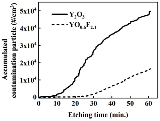 Yttrium oxide (Y2O3) and yttrium oxyfluoride (YO0.6F2.1) protective coatings were prepared by an atmospheric plasma spraying technique. The coatings were exposed to a NF3 plasma. After the NF3 plasma treatment, the mass loss of the coatings showed that the etching rate of YO0.6F2.1 was larger than that of the Y2O3. X-ray photoelectron spectroscopy revealed that YO0.5F1.9 was present in the Y2O3 coating, whereas YO0.4F2.2 was present in the YO0.6F2.1 coating. Transmission electron microscope analysis conducted on contamination particles generated during the plasma etching showed that both coatings were mainly composed of YFx. The contamination particles estimated by in-situ particle monitoring sensor revealed that the YO0.6F2.1 compared with the Y2O3 coatings produced 65% fewer contamination particles.
