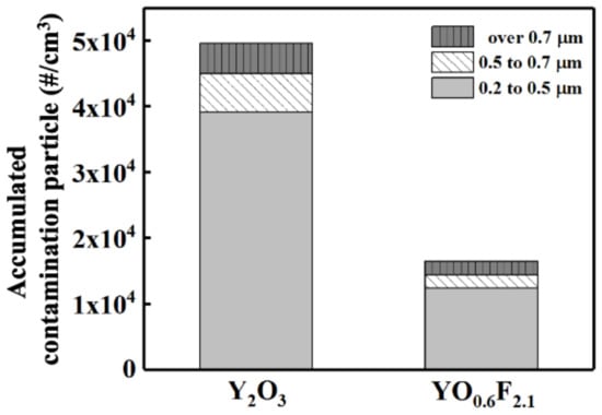 Figure 5 shows the real-time concentration of accumulated contamination particles generated from the Y2O3 and YO0.6F2.1 coatings during the NF3 plasma treatment of 60 min. The YO0.6F2.1 coating produced fewer contamination particles than did the Y2O3 coating; the concentration of particles measuring over 0.2 µm from the YO0.6F2.1 coating was less than 65% that of the Y2O3 coating. Figure 6 shows the distribution of the sum of contamination particles from Figure 5. Most contamination particles had sizes falling in the range of 0.2 to 0.5 µm. The etching rate of YO0.6F2.1 was higher than that of Y2O3 in NF3 plasma. However, YO0.6F2.1 produced less contamination particle than Y2O3. This can be explained as follows. The boiling temperature of Y2O3 and YF3 are 4570 and 2500 K, respectively. In addition, the sublimation enthalpies of Y2O3 are also higher than that of YF3. Hence, Y2O3 is more stable and more difficult to vaporize than YF3. Therefore, its sputtering yield by ion bombardment may be lower for the Y2O3 than for the YF3 containing a relatively large amount of oxygen. This is consistent with the result of Reference 17 and 30, where the etching rate differences depend on the bias voltage [,]. On the surface of Y2O3, YOxFy layer and volatile NOx are formed by the chemical reaction with the fluorine radical. On the other hand, YOxFy layer and NOx can be formed less on the surface of YO0.6F2.1 because Y–F bond already exists. Also, the less oxygen on the coating surface, the smaller the chemical reaction. Thus, the Y2O3 surface provides a more appropriate environment for the growth of YOxFy (or YF3) contamination particles, and, therefore, more contamination particles from Y2O3 are generated compared to YO0.6F2.1 [,]. Furthermore, in the case of YO0.6F2.1 surface, physical etching is more likely to occur than chemical etching by fluorine radical. YO0.6F2.1 is relatively inadequate to grow YF3 contamination particle compared to Y2O3.