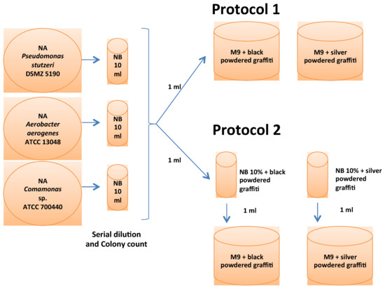 In order to optimize the selected bacterial growth, two protocols were tested (Figure 1). Previous findings regarding biocleaning were taken into account in developing both protocols. Some authors have tested protocols based on the use of general culture media supplemented with the substance to be cleaned. For example, Ranalli et al. [13] used Plate Count Agar supplemented with animal glue for the bioremoval of animal glue from wall paintings. By contrast, other authors used mineral media supplemented with the substance to be cleaned. For example, Bosch-Roig et al. and Ranalli et al. used M9 mineral medium supplemented with animal glue to clean glue deposits [14,15] and nitrate broth to clean nitrate salts [16]. Studies specifically involving the bioremoval of graffiti used both culture media strategies: Mineral salt solution and Trypticase Soy Broth (TSB) [10,11]. On the basis of the findings of these studies, we tested two growth protocols: One with a mineral salt solution (M9) supplemented with powdered graffiti (Protocol 1) and another with a general culture medium (Nutrient Broth) supplemented with powdered graffiti (Protocol 2). The approach used in protocol 1 was of particular interest because it assumes that bacteria can be grown with only powdered graffiti (Figure 2) as a source of carbon.