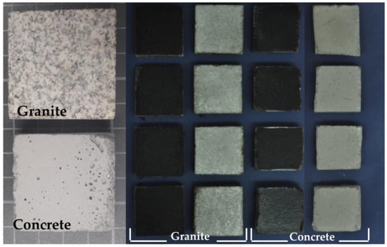 The specimens of granite and concrete used in this study exhibited an open porosity of approximately 3% and 20%, respectively. Porosity was determined by vacuum water absorption of samples in accordance with UNE-EN 1936 [21].