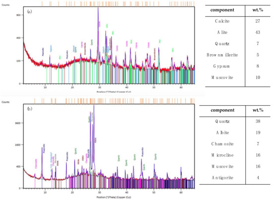 Cement paste was prepared specifically for this study by a local construction company (Breixo S.L. Obras e Servicios, Santiago de Compostela, Spain), in accordance with EN 197-1 [20]. The paste was thus made using a proportion of 1 volume cement to 4 volumes of sand (i.e., 364 kg/m3 cement: 1450 kg/m3, sand: 240 kg/m3 water). The cement and sand were analysed by X-ray diffraction (XRD) (Figure 4). Portland cement (PC) clinker was used to produce the concrete (Figure 4a), as indicated by the presence of alite (calcium silicate) as the major mineral phase (43%), together with the presence in excess of calcite (27%) relative to the presence of quartz (7%), i.e., CaCO3/SiO2 >1, a necessary condition for alite (preferred clinker phase). The diffractogram also includes another of the four phases of the Portland cement clinker, brownmillerite or ferrite (5%), a dark brown calcium aluminoferrite that acts as a diluent in the cement, as well as free mica minerals, muscovite (10%), which significantly affect the plasticity index, compacted density and strength of the cement. Together with the clinker, the ground gypsum (8%) is the second component of PC (Figure 4a).