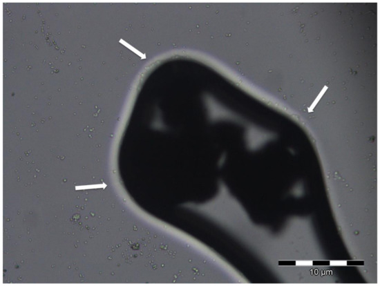 Micrograph of particles of powdered graffiti surrounded by biofilm (white arrows).