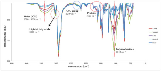 Infrared spectra of silver powdered graffiti after treatment with bacteria. Silver graffiti spray paint; control, without bacteria; 13,048 corresponds to Aerobacter aerogenes; 700,440 corresponds to Comamonas sp., and 5190 corresponds to Pseudomonas stutzeri.