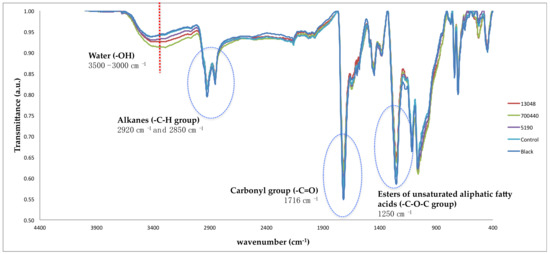 Infrared spectra of black powdered graffiti after treatment with bacteria. Black graffiti spray paint; control, without bacteria; 13,048 corresponds to Aerobacter aerogenes; 700,440 corresponds to Comamonas sp., and 5190 corresponds to Pseudomonas stutzeri.