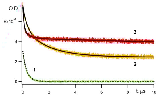 Kinetics of 3B* measured at λ 630 nm at 263 K obtained under laser flash photolysis of B in E film (1); decay kinetics of BH• measured at λ 545 nm at 263 (2) and at 313 K (3) in the same film. Solid black lines are the computer fit of the experimental curves. In this figure and in figures below, O.D. stands for optical density. Adapted from Ref. [].