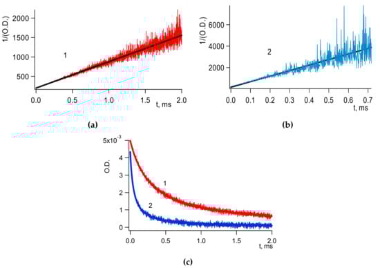Decay kinetics of BH• measured at λ 545 nm at times ≥10 μs obtained under laser flash photolysis of B in E films at 263 (1) and at 313 K (2). The top of the figure: A fit of curves into the second-order kinetic law. Adapted from Ref. []. (a) A fit of curve 1 of the figure c; (b) A fit curve of curve 2 of the figure c; (c) Experimental kinetic curves.