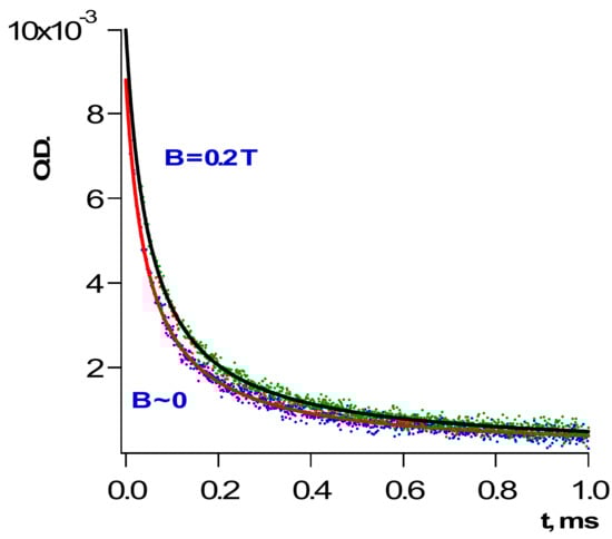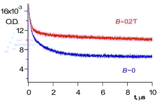 Usage of magnetic field (MF) slows down recombination of a triplet geminate pair and recombination of radicals in a bulk of a viscous solvent or a polymer [,,]. Figure 3 and Figure 4 below demonstrate a couple of examples.