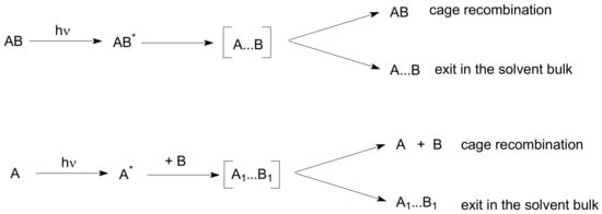 It is believed that photogenerated molecules are born in a certain cage of a solvent, which does not allow their immediate separation. Molecules undergo recombination into the starting or some other product in the cage. Concurrently photogenerated molecules separate from each other and react with each other or with other molecules like acceptors on the solvent bulk, as shown in Scheme 1.