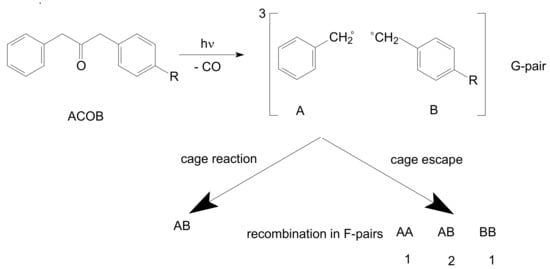There is a multitude of individual commercial polymers, polymeric coatings with quite different properties. We will cite in this work several polymers which were used as a matrix for the study cage effect under photolysis of low-MW compounds dissolved or dispersed in these polymers. One approach is based on product analysis of photodissociation of organic compounds in polymers. It was successfully used by Weiss, Chesta, and their collaborators [,,,,,]. Norrish type I cleavage of 1-(4-alkylphenyl)-3-phenyl-2-propanone (ACOB) was used as a probe of polymer matrices: