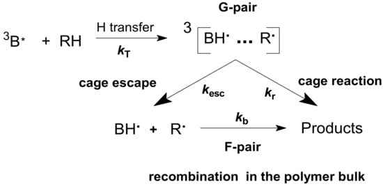 Obviously, cage escape means that radicals enter the solvent bulk and participate in bimolecular recombination in the absence of acceptors. BH•, which is the product of the cage dissociation, decays relatively slowly in the bulk of a polymer (Scheme 3, Figure 2 and Figure 3):