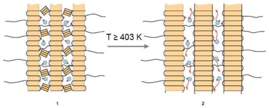 According to the ESR data with a spin probe, the amorphous phase (case 1) is in a strained and less mobile state compared to case 2 (Scheme 4). BOPP (case 1) is a typical polymer with barriers for a retarded diffusion. Such a condition limits the mobility of BH•. In case 2, the amorphous phase relaxes due to preheating and allows faster translational diffusion of BH• compared to case 1 []. Almost all small crystallites merge with large crystallites at T close to 423 K []. In estimation of ref. [], that merger leads to an increase of the average size of crystallite by 1.5 times.