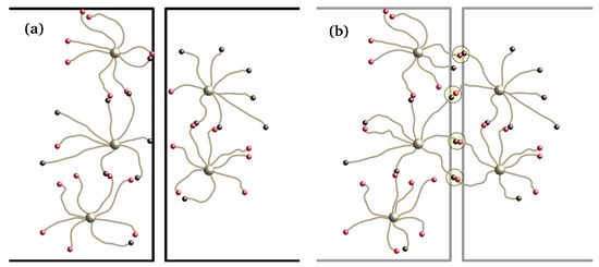 The building blocks of our vitrimer networks are star polymers with eight arms which have the binding moieties at their ends. Star polymers are a versatile basis for adaptive networks [15] and are widely used for hydrogels [20]. In this work, we employed a coarse-grained representation which allows to distinguish between bonds in which the two binding moieties are identical, and bonds in which they are different. We focus on the latter type: Our binding groups represent, e.g., carboxyl and hydroxyl groups so that the bonds are ester bonds, and the swap mechanism is a transesterification reaction [16,21]. In Figure 1, we represent the two types of ends with black and red beads, respectively. Each arm of the star is a sequence of 5 beads connected by harmonic springs with rest length , which in our simulations serve as the unit of length. The beads interact with a repulsive Weeks–Chandler–Andersen (WCA) potential [22]: