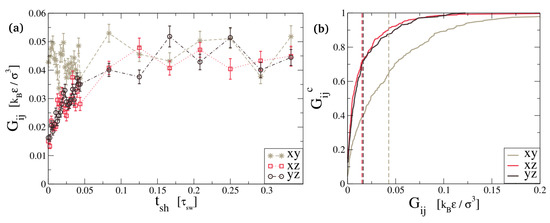 The mechanical test consists of a measurement of the stress relaxation modulus of the topologically frozen configuration, using the autocorrelation method [24]. This tells us how much mechanical resistance the sample has gained from the newly formed bonds. As expected for a solid-like material, the stress relaxation modulus shows a plateau for long times, corresponding to the static shear modulus. In Figure 3, we report the component of the stress relaxation modulus, which is not affected by the adhesion process because the surface across which it is happening is parallel to the -plane, in gray. The graph also shows the and components, which should start at a lower value of G because before the healing process, there are no bonds across the gap. The figure clearly shows that the component is independent of healing time, while the other two components develop a value of the order of the component within . This signals that the material has acquired a roughly isotropic elasticity, and mechanical testing can no longer reveal where the disconnected surface used to be.