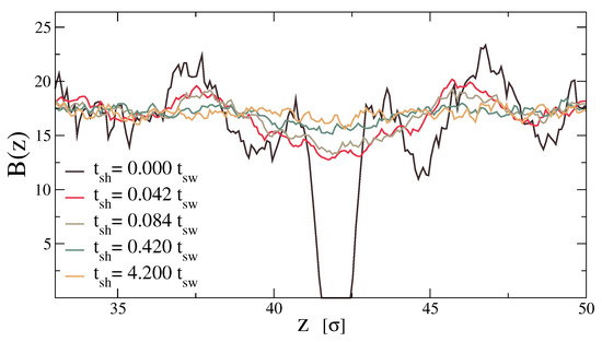 A complementary view of the healing process can be seen from the point of view of the bonds. In Figure 4, we show, as a function of coordinate z, the number of star–star bonds that cross a fictitious plane perpendicular to the z-axis at that position. Without any healing, there are no bonds that cross the region of the cut, around . There is also an evident layering effect at that produces zones of high density of bonds just around the cut, followed by a zone of low density and then an even higher concentration. This effect disappears after the third high density layer at the edge of Figure 4. The curves for higher values of demonstrate that the healing process eliminates the gap and reduces the layering, reinforcing the picture that the material is losing its memory of where the interface used to be.