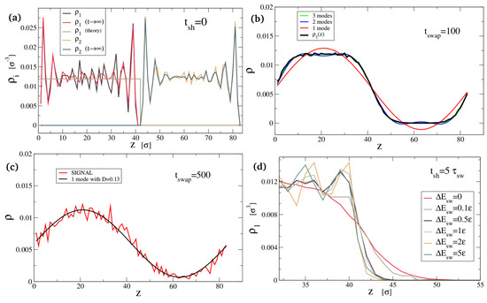 Density profiles at . (a) At , layering is visible in the density profiles, so the square wave cannot capture the full details yet. The layers are stable if we equilibrate without healing (preventing swap). (b) At , the density profile is well-reproduced by the three slowest modes of the Fourier expansion. The system is diffusing with when . (c) At , only one mode is still present. Notice that the diffusion is far from reaching equilibrium. (d) The diffusion is slower when swaps are hindered by an energy barrier .