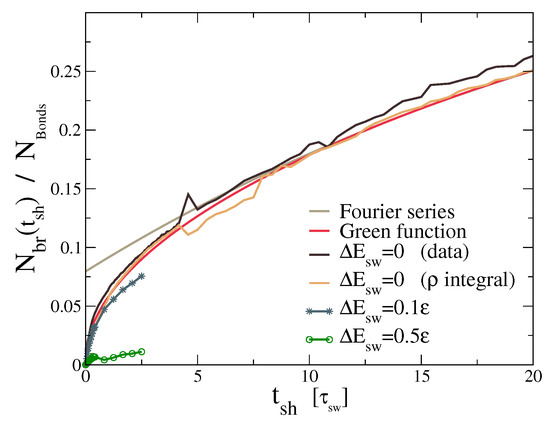 Actual number of bridges (black) compared to the estimation of Equation (2) evaluated from the numerical simulations (orange), Fourier series (gray), and Green function (red). The Fourier and Green function curves use the previously fitted value , which represents the case of bond-swap without energy barriers. The plotted quantity should approach the limit of upon full mixing, which happens well beyond the limit of our simulations (see Figure 5). A barrier of is already enough to undermine the bridge formation. The gray curve is a truncated Fourier series that only takes into account the three slowest modes and is therefore not expected to match well at short times.