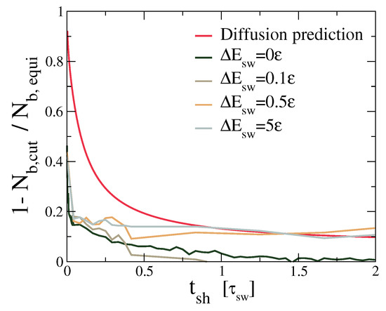 In Figure 5a–c, we show the density profiles that we measure in our simulations for 3 different values of the healing time (black curves). Figure 5a additionally shows that the density profile after a long equilibration with the swap mechanism turned off (red curve) is only marginally different from the profile before any equilibration, proving that bond swapping is necessary to have any mobility of the star polymers: when the swap mechanism is turned off. In panels b and c, we compared the density profiles from the simulation to the Fourier series solution of the diffusion Equation (1), providing a fit of the diffusion constant . These simulations were performed without any energy barrier to swapping. We could easily adjust the system to have an energy barrier by setting , in order to reduce the diffusion constant D. Figure 5d shows how this way of slowing down diffusion alters the density profile after a healing time of .