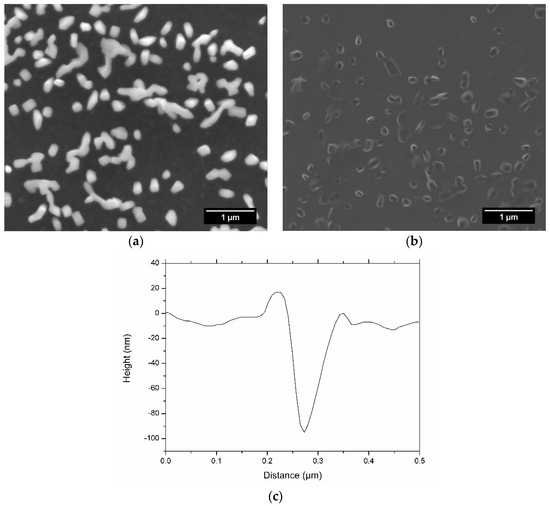 The sample with a lower Zn content has 9.6 at.% Zn, 3 at.% oxygen and a film thickness of about 515 nm. It shows mostly separate particles within its surface. The Zn particles have a width of about 100–200 nm, see Figure 1a. Some of them formed interconnected structures of about 1000 nm length. That the particles extend below the carbon surface can be seen when etching the sample. In Figure 1b an SEM image of the etched surface is shown. The brighter structures associated with Zn have gone and, instead, holes are present, whose dimensions correlate with those of the particles in Figure 1a. In Figure 1b, the edges of the holes appear brighter. A small ridge, as seen in the line scan from an AFM measurement, Figure 1c, surrounds each hole. This ridge is about 20 nm high. The hole has a width of about 95 nm on the level of the surface. It narrows with increasing depth and has a total depth of about 90 nm.
