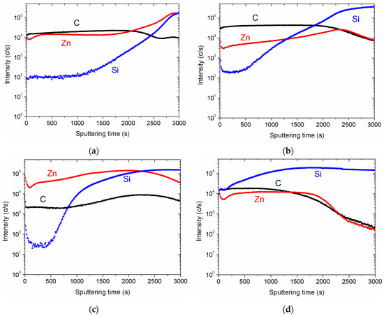 Secondary ion mass spectrometry (SIMS) depth profiles of Zn-DLC samples, showing the signals 12C, 30Si and 64Zn (a) 9.6 at.% Zn, as prepared; (b) 9.6 at.% Zn, etched; (c) 38.9 at.% Zn, as prepared; (d) 38.9 at.% Zn, etched.