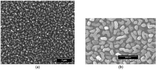 Several approaches have been utilized so far to prepare a DLC film with an inherent nanostructure. DLC deposition on an already structured surface shifts the task of structuring to the substrate. However, with mechanical and simple chemical methods it is difficult to produce a defined roughness [9]. When using a structured substrate, it has to be ensured that a homogeneous deposition can be accomplished. Thicker films will decrease the roughness, as mentioned above. Another approach is the DLC deposition on a partially masked surface. Metallic masks [10,11] and powder particles [12] have been used in this context to prevent localized deposition on the substrate. Especially with masks, only a coarse patterning with dimensions of several tens of µm is achievable. Another possibility is the subsequent structuring of an initially smooth DLC film. If the partial, laterally resolved removal of the film involves focused beams, e.g., one [13] or several laser beams [14,15] or an ion beam [16], the process is slow and costly. In summary, these techniques either produce surface structures with dimensions in the µm range or they are not suitable for the treatment of large areas.