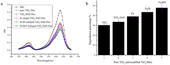 Methyl green (MG) is a common organic dye. The industrial wastewater containing MG is discharged into the natural environment in most cases. In view of its carcinogenicity, the removal of methyl green from wastewater as much as possible is a prerequisite. The UV-Vis absorption spectra (a) and the degradation percentage (b) of the methyl green solutions employing pure TiO2, TiO2-ZnO, Fe doped TiO2-ZnO, Fe/B didoped TiO2-ZnO, and Fe/B/F tridoped TiO2-ZnO films under the irradiation of UV-lamp centered at 365 nm for 45 min are shown in Figure 1. From Figure 1b, the order of the degradation percentage using a pure TiO2 or a modified TiO2 was as follows: Fe/B/F tridoped TiO2-ZnO (47.9%) > Fe/B didoped TiO2-ZnO (43.5%) > Fe doped TiO2 (39.1%) > TiO2-ZnO (33.6%) > pure TiO2 (30.3%). Obviously, the degradation rate of the Fe/B/F tridoped TiO2-ZnO film was the highest among all the samples. In other words, the Fe/B/F tridoped TiO2-ZnO film has the best photocatalytic activity in these samples.
