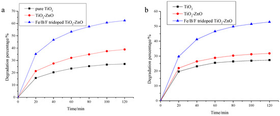 The photocatalytic performance of the catalyst was further evaluated by the degradation rate of the methyl green solution and formaldehyde solution under visible light irradiation. The decomposition kinetics of the methyl green and formaldehyde solutions using pure TiO2, TiO2-ZnO, and Fe/B/F tridoped TiO2-ZnO films under visible irradiation for 120 min were illustrated in Figure 2a,b, respectively. As depicted in Figure 2a, the degradation percentage of the methyl green solutions utilizing the Fe/B/F tridoped TiO2-ZnO film was 62.4, exceeding that of pure TiO2 film (27.1) and TiO2-ZnO film (38.9). Figure 2b demonstrated that the degradation percentages of the formaldehyde solutions using pure TiO2, TiO2-ZnO, and Fe/B/F tridoped TiO2-ZnO films were 27.3, 31.8, and 52.9, separately. That is to say, organic dyes and volatile organic pollutants can be effectively degraded by Fe/B/F tridoped TiO2-ZnO photocatalyst.