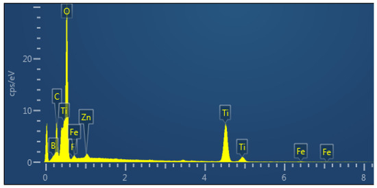 The composition of the Fe/B/F tridoped TiO2-ZnO film by EDS is shown in Figure 3. The atomic weight concentrations of Fe, B, F, Zn, C, O, and Ti in the film were 1.29, 1.54, 0.29, 0.98, 11.45, 47.16, and 37.29, separately. C atoms may come from residual organic matter.