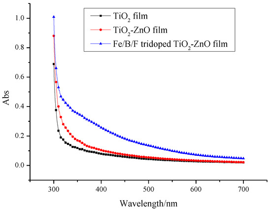 The UV-Vis absorption spectra of TiO2, TiO2-ZnO, and Fe/B/F tridoped TiO2-ZnO films are illustrated in Figure 4. The absorption edge of the Fe/B/F tri-doped TiO2-ZnO film had a significant red shift, namely, the photons with lower energy can also participate in the photocatalytic reaction, thus increasing the photocatalytic activity of the catalyst.