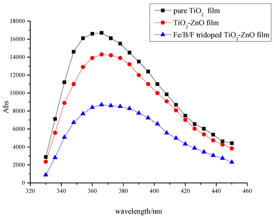 The photogenerated electron-hole pair’s recombination rate of pure TiO2, TiO2-ZnO, and Fe/B/F tridoped TiO2-ZnO films can be evaluated via PL spectrum. As shown in Figure 5, although the samples had different fluorescence luminescence intensities, they had the same peak position in 370 nm. Among the three samples, the Fe/B/F tridoped TiO2-ZnO film had the lowest emission peak intensity, namely, it had the lowest recombination rate of the photogenerated electron-hole pairs. The decreasing recombination rate of electron-hole pairs can enhance the photocatalytic activity of the sample.