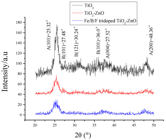 The XRD patterns of pure TiO2, TiO2-ZnO, and Fe/B/F tridoped TiO2-ZnO films heated at 450 °C for 60 min are demonstrated in Figure 6. The samples exhibited a mixture of anatase (25.32, 37.52, 48.36), brookite (30.24), and rutile (27.48, 36.11), but the anatase phase is dominant. Compared to pure TiO2 and TiO2-ZnO, the diffraction peak of the Fe/B/F tridoped TiO2-ZnO sample was wider and weaker, indicating that the crystal size was smaller. According to the Scherrer formula: d = 0.9 λ/β cos θ, the average size of Fe/B/F tridoped TiO2-ZnO (5.6 nm) was smaller than that of pure TiO2 (9.2 nm) and TiO2-ZnO (6.8 nm). On account of the small doping amount and the even distributing of Fe, B, and F ions, there were no obvious compound peaks associated with them. In addition, the content of ZnO in the TiO2-ZnO composite film was extremely small or the peak intensity of TiO2 was too strong to cover the weak peak of ZnO, so the diffraction peak of ZnO was not also observed. Catalysts composed of smaller particles or crystal sizes are more effective in degrading organic pollutants.