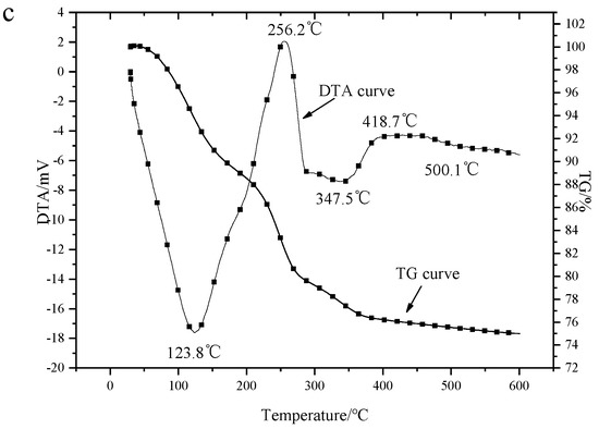 The diffraction reflectance absorbance spectra (DRS) of the samples was measured by a UV-Vis spectrophotometer equipped with an integrating sphere accessory (TU-1901, Beijing general instrument co. LTD, Beijing, China). The X-ray diffraction with a diffractometer was used to characterize the crystalline structure of the samples (AXS, Bruker, Karlsruhe, Germany). The recombination of e−/h+ pairs was measured via the photoluminescence (PL) spectrum recorded by a spectrometer (FLS920, Edinburgh Instruments, Edinburgh, UK). The nitrogen adsorption–desorption isotherm of the sample was obtained using the apparatus to analyze the Brunner–Emmet–Teller (BET) surface area (ASAP2020, Microme, Atlanta, GA, USA). The differential thermal analysis-thermogravimetry (DTA-TG) curves of the samples were used to investigate the crystallization behaviors with temperature (HCT-1, Beijing hengjiu experimental equipment co. LTD, Beijing, China). The field emission scanning electron microscopy (FE-SEM) was used to observe the surface morphology of the samples (SUPRA 55, ZEISS, Oberkochen, Germany).