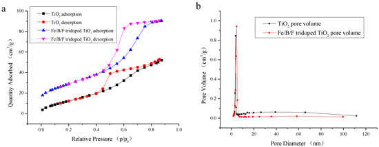 Figure 8 illustrates the N2 adsorption/desorption isotherms (a) and pore size distribution (b) of pure TiO2 and Fe/B/F tridoped TiO2-ZnO powders heated at 450 °C for 60 min. As demonstrated in Figure 8a, the specific surface area of Fe/B/F tridoped TiO2-ZnO was 105.0 m2/g, while that of pure TiO2 was 84.0 m2/g at the same pressure. Adding Fe/B/F ions and ZnO to TiO2 can reduce particle size, thereby enhancing the specific surface area of TiO2. From Figure 8b, the mean pore size of pure TiO2 was 6.0 nm, while that of Fe/B/F tridoped TiO2-ZnO was 5.2 nm, which was caused by Fe/B/F or ZnO inserted into the pores of TiO2. Smaller pore size and larger specific surface area can facilitate the adsorption of O2, H2O and contaminants, thereby enhancing the photocatalytic performance of TiO2.