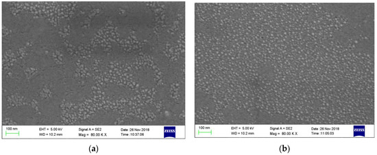 The FE-SEM micrographs of pure TiO2 and Fe/B/F tridoped TiO2-ZnO films are shown in Figure 9. As can be observed in Figure 9a, more particle aggregates with a non-uniform distribution and cracks appeared on the surface of pure TiO2. However, as shown in Figure 9b, by ZnO compositing and Fe/B/F tridoping, less particle aggregates and almost no cracks on the surface of TiO2 were observed. The uniform dispersion of the particles can increase the contact area of the active reactants, thereby increasing the photocatalytic activity of the catalyst.