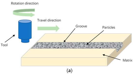 A common method to fabricate surface composites is to pre-manufacture grooves on the surface of plates and then fill them with reinforced particles (Figure 4a). The grooves are then capped with a pin-less tool via FSP—this prevents the particles from splashing. Subsequently, the tool with a pin is used in the multi-pass FSP process along with pre-manufactured grooves; thus, the reinforced particles are uniformly distributed with material flow [,,,,,,,,,]. In addition, the surface composites with a homogeneous distribution of strengthening phases were also obtained by adding reinforced particles after drilling blind holes on the surface of the workpieces [,,] (Figure 4b).