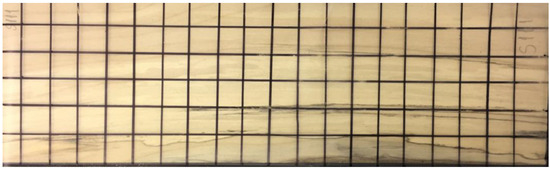 The classification of the spalted wood specimens was done based on the zone lines present on the surface of the specimen. An acetate template the same size of the specimens was divided in 120 squares, Figure 1, and used to sort the wood. If any zone lines were present in 40% or more of the squares, the specimen was used; otherwise, the sample was discarded. The variability among the specimens was high, so the selection of the specimens tried to minimize the impacts of this high variability of spalted wood in the final results.