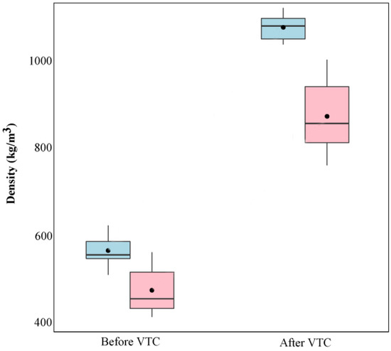 Interestingly, the performance of the VTC treatment in spalted wood was statistically different than in sound wood. The treatment caused higher density changes in sound wood than in spalted wood. In theory, the VTC treatment should have performed equally or better in spalted wood, as its pre-treatment average density was lower than the pre-treatment average density of sound wood, 472 and 562 kg/m3, respectively. This assumption was supported by a study that investigated the densification of alder, beech, birch, and pine veneers, which showed that the wood with the lowest density was the one that achieved the highest density after treatment [28].