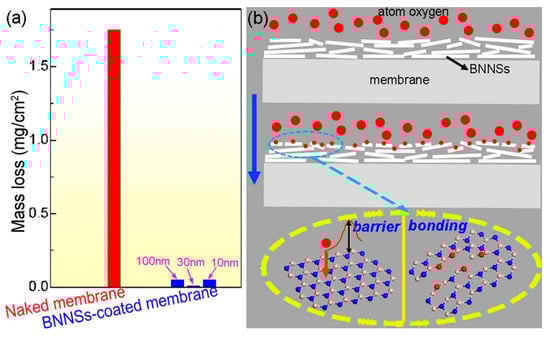 Low earth orbit (LEO) contains an abundance of atomic oxygen (oxygen radicals) generated from atmospheric photodecomposition. Spacecraft in LEO have speeds of up to 8 km/s which yields a collision energy of atomic oxygen (AO) of about 5 eV with high atomic incoming flux (1014 to 1015 atoms/cm2) [58]. Coatings of 2D material can be applied to passivate spacecraft in LEO [59]. For example, the polymer parts of a spacecraft can be passivated from atomic oxygen using boron nitride nanosheet (BNNS) coatings (Figure 3). The BNNS flakes reduce corrosion of nylon by blocking and physio absorbing the oxidizing species [60].