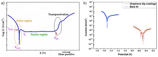 (a) Graph obtained from a potentiodynamic (PD) test showing three regions: (1) active region—indicates active corrosion, (2) passive region—indicates the formation of passive protecting film, (3) transpassivation region—indicates the initiation of passive film dissolution at high potential. Adapted with permission from ref. [65] under Creative Commons Attribution 4.0 International License; (b) graph obtained for graphene coating on Al substrate in 0.5 M NaCl exhibiting anti-corrosion ability of graphene. Reprinted with permission from ref. [68]. Copyright 2014 Elsevier.