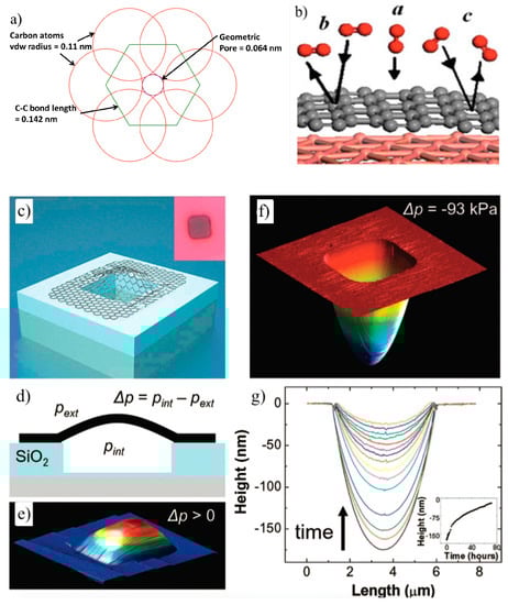 The pressure difference, ΔP, across a 2D material can increase the molecular diffusion. Impermeability of continuous and defect-free few-layer graphene (FLG) to various gases (i.e., He, Ar, and air) has been investigated [22]. A continuous graphene sheet was suspended over a microchamber created in a SiO2 substrate (Figure 5c). Graphene was adhering onto the SiO2 through the van der Waals force between the graphene and substrate. The suspended graphene underwent outward and inward balloon shaped deformations due to positive and negative ΔP values, respectively (Figure 5e,f). The deformation size decreases with time due to gas permeation through the substrate walls and the clamped SiO2-graphene interface (Figure 5g). Gas permeation does not occur transversely through the graphene, which was demonstrated by establishing an independent relationship between the gas leakage rate and graphene layer thickness. Thus, the graphene remained impermeable under pressures higher than one atmosphere.